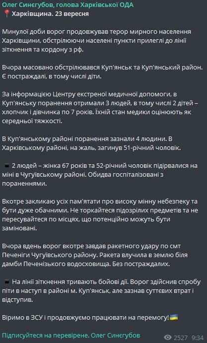 Об этом сообщил глава Харьковской ОВА Олег Синегубов в своем тг-канале.