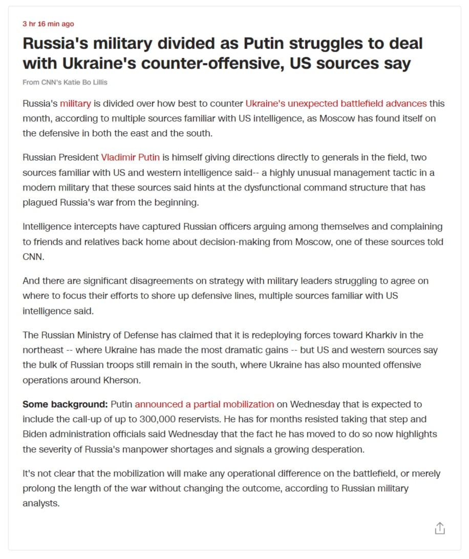 10:30 Американская разведка считает, что российских вооруженных силах есть серьезные разногласия по поводу стратегии противодействия наступлению ВСУ после того, как войска РФ оказались в обороне как на востоке, так и на юге Украины. Об этом со ссылкой на источники сообщает CNN.