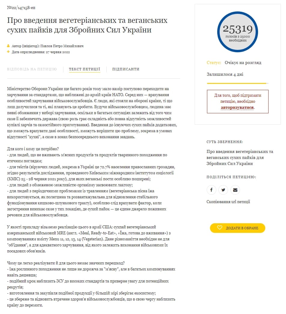 10:35 Петиция президенту о введении вегетарианских и веганских сухих пайков для Вооруженных Сил Украины набрала более 25 тысяч голосов. Теперь обращение должно рассмотреть Владимир Зеленский.