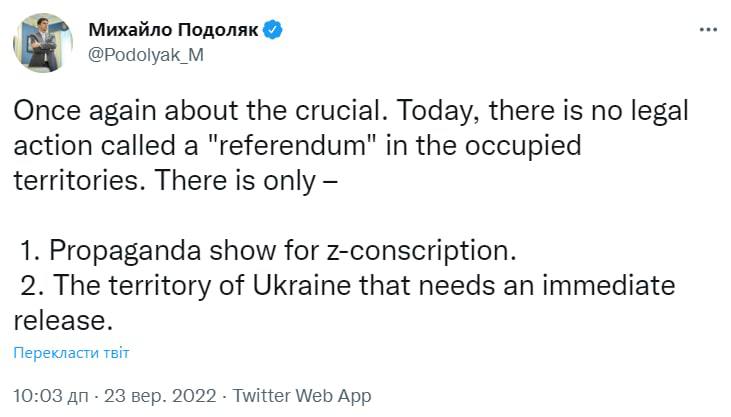 "Сегодня на оккупированных территориях нет никакого юридического действия под названием «референдум». Здесь есть только пропагандистское шоу для проведения Z-мобилизации и территория Украины, требующая немедленного освобождения", - написал он.