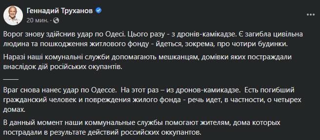 21:14 Сегодня российские войска с помощью иранских беспилотников нанесли удар по Одессе. Все телеграмм-каналы облетело видео интенсивной стрельбы из автоматического оружия в центре Одессы по дронам треугольной формы. Также, сообщалось, что по ним работает ПВО, которое сбило один дрон.