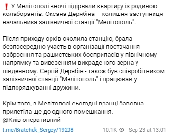 Ранее сообщалось, что по данным мэра Мелитополя, в городе коллаборанты паникуют и отказываются дальше сотрудничать с оккупантами. По его словам, местные власти продолжат публиковать списки предателей.