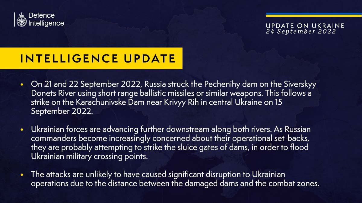 В новой сводке разведка Британии напоминает, что удары по Печенежской дамбе на Северском Донце наносились 21 и 22 сентября. РФ атаковала ее, используя баллистические ракеты малой дальности или аналогичное оружие. Это произошло после удара по Карачуновской дамбе под Кривым Рогом 15 сентября.