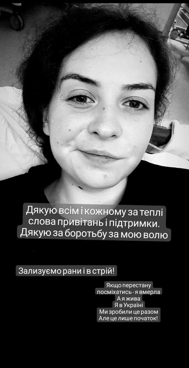 "Спасибо всем и каждому за теплые слова приветствий и поддержки. Спасибо за борьбу за мою свободу. Зализываем раны - и в строй! Если перестану улыбаться - я умерла. А я жива. Я в Украине. Мы сделали это вместе. Но это лишь начало! - пишет Катерина.