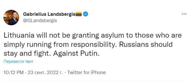 "Литва не будет предоставлять убежище тем россиянам, которые просто убегают от ответственности и пытаются уйти от мобилизации. Россияне должны остаться и сражаться. Против Путина", - написал Ландсбергис в твиттере.