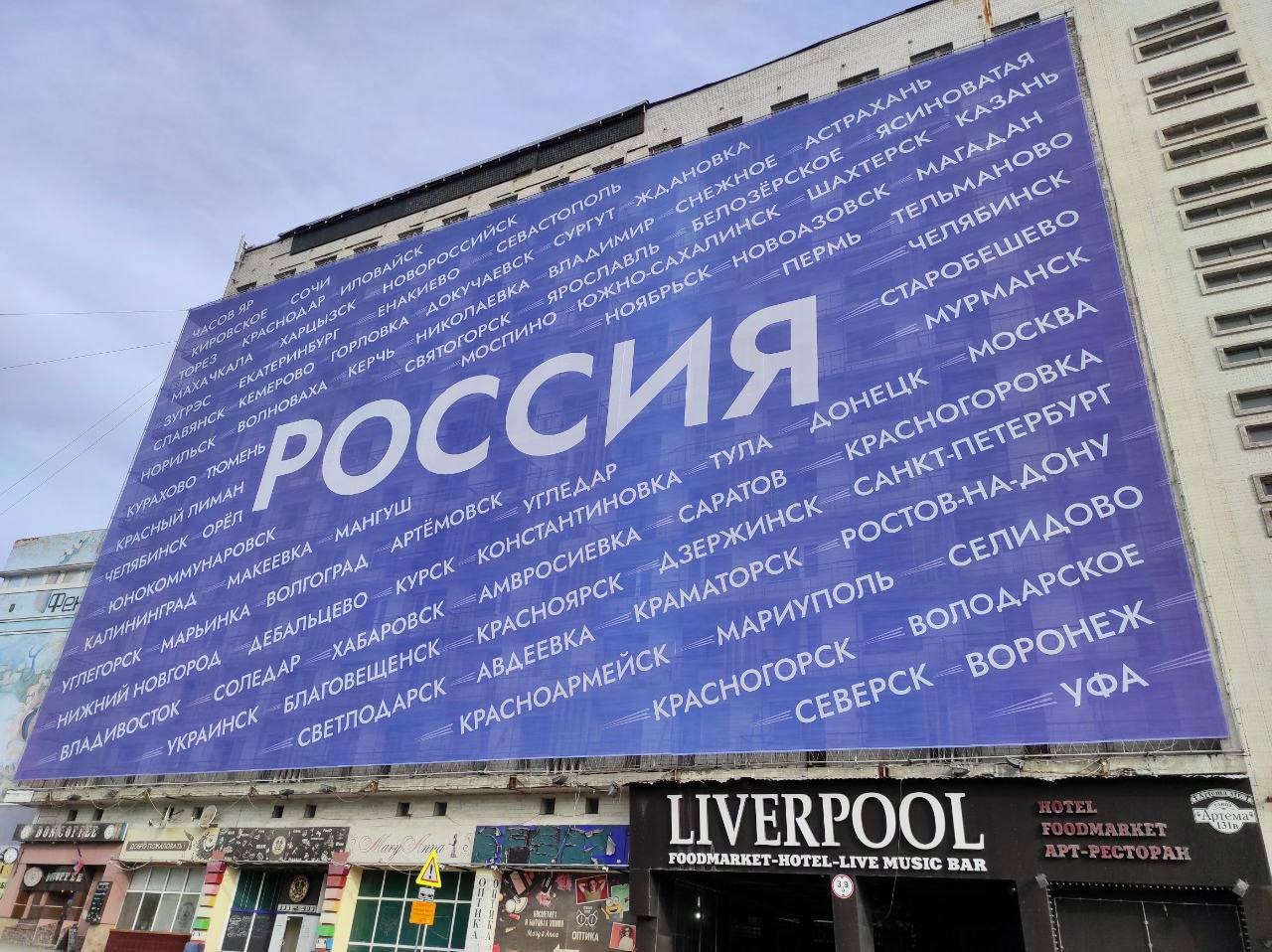На фоне - название множества городов, причем населенные пункты Донбасса стоят рядом с такими названиями, как "Волгоград", "Сургут", "Владивосток" и так далее. В центре - большими буквами написано "Россия".