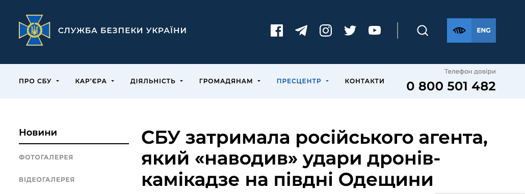 СБУ заявила о задержании корректировщика российских ударов беспилотниками по Одесской области.