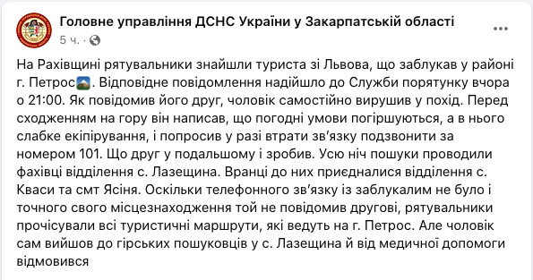 Всю ночь спасатели искали заблудившегося, к утру к ним присоединился дополнительный отряд, однако турист сам вышел к горным поисковикам в с. Лазещина, отказавшись от медицинской помощи.