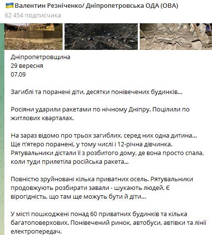 Ночной ракетный удар РФ пришел по жилым кварталам Днепра. Об этом сообщил губернатор Днепропетровской области Валентин Резниченко.
