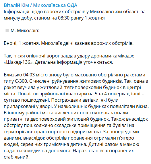 Ночью с 30 сентября на 1 октября войска РФ ударили по Николаеву ракетами С-300 и дронами-камикадзе "Шахид-136". В результате обстрелов пострадали пять человек, в том числе трехмесячный ребенок.