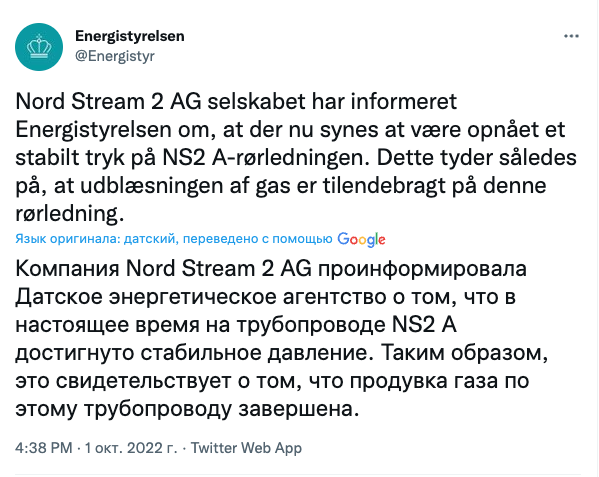"Компания Nord Stream 2 AG проинформировала Датское энергетическое агентство о том, что сейчас на газопроводе NS2 A достигнуто стабильное давление. Таким образом, это свидетельствует о том, что утечка газа на этом трубопроводе прекратилась", — говорится в сообщении.