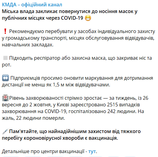 "Рекомендуем находиться в средствах индивидуальной защиты в общественном транспорте, местах обслуживания посетителей, учебных заведениях. Подходит респиратор или защитная маска, закрывающая нос и рот. Предпринимателей просим обновить маркировку для соблюдения дистанции не менее 1,5 м между посетителями", - говорится в сообщении КГГА.