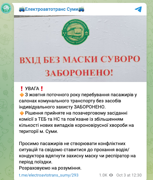 В Сумах возвращают обязательный масочный режим в общественном транспорте