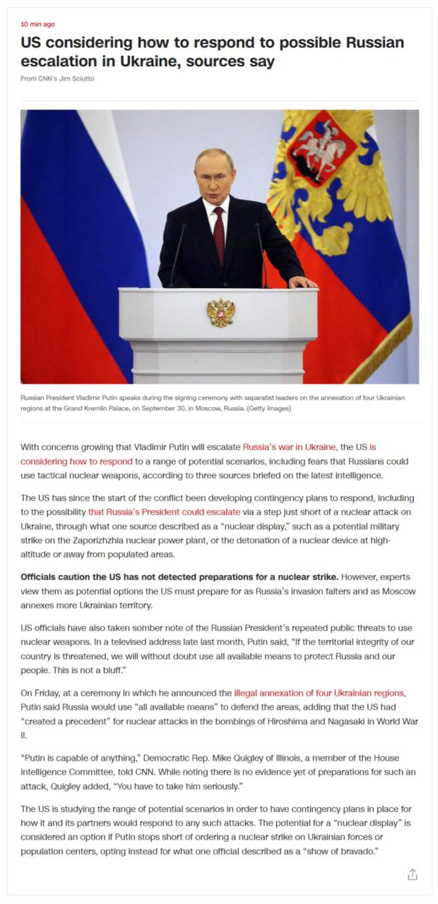 При этом несмотря на заявления официальных лиц, что США не обнаружили подготовки к нанесению ядерного удара, эксперты рассматривают их как потенциальные варианты, к которым США должны подготовиться, поскольку российское вторжение ослабевает, а Москва уже аннексирует территории Украины, пишет издание.
