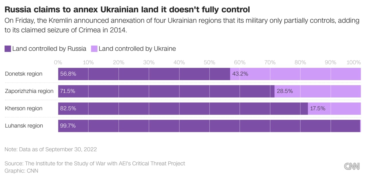 Агентство CNN посчитало, какой процент территории четырех областей Украины, об аннексии которых объявили в РФ, находится под российским и украинским контролем (по состоянию на 30 сентября).