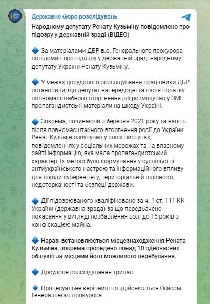 Народному депутату от "Оппозиционной платформы - За жизнь" (ОПЗЖ) Ренату Кузьмину объявлено о подозрении в государственной измене.