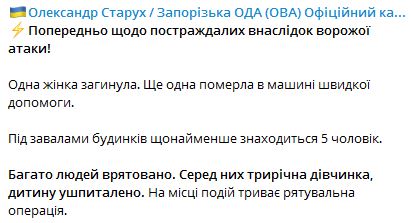 Удар по Запорожью. Известно о двух погибших женщинах, под завалами остаются пять человек