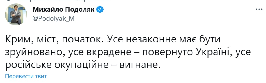 "Крым, мост, начало. Все незаконное должно быть разрушено, все украденное – возвращено Украине, все российское оккупационное – изгнано", - написал он в твиттере.