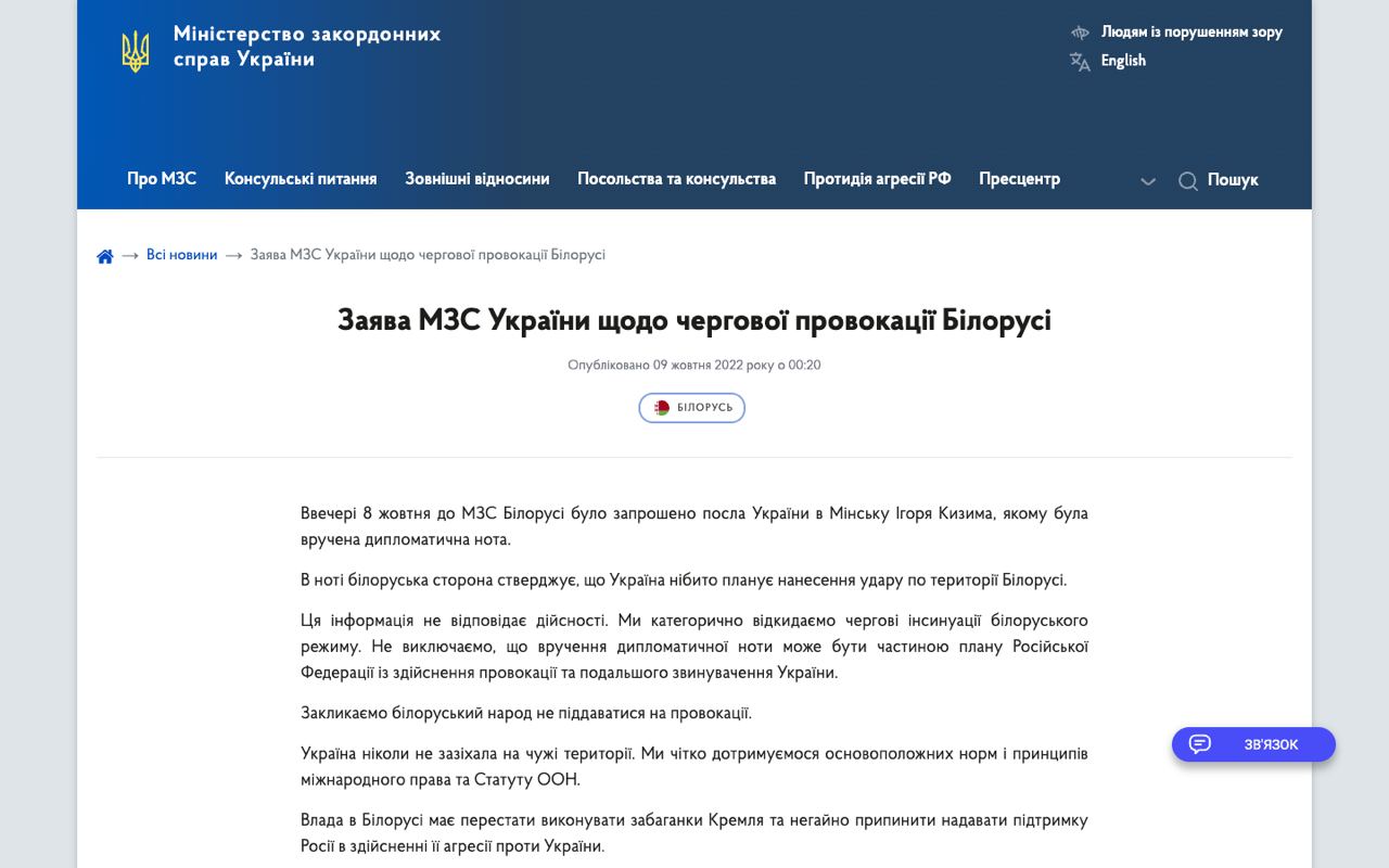 Украинского посла в Беларуси вечером 8 октября вызвали в минский МИД, обвинив Украину в подготовке удара по территории Беларуси. Послу Игорю Кизиму вручили соответствующую дипломатическую ноту.
