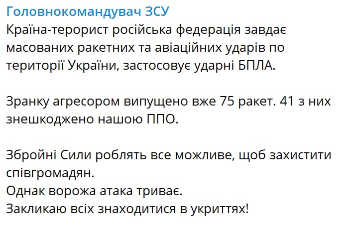 Главком ВСУ Валерий Залужный сообщил, что по Украине на данный момент выпустили 75 ракет, 41 из них была сбита.