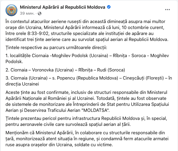 "Цели представляли опасность для инфраструктуры Республики Молдова и, в частности, для гражданских самолетов, летающих над воздушным пространством страны. Отметим, что Минобороны во взаимодействии с ответственными структурами страны внимательно следит за ситуацией в регионе и решительно осуждает атаки российской армии на города Украины, повлекшие за собой человеческие жертвы", - говорится в заявлении.