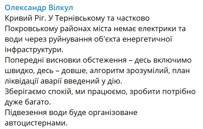 "В Терновском и частично Покровском районах города нет электричества и воды из-за разрушения объекта энергетической инфраструктуры. Предварительные выводы обследования - где-то включим быстро, где-то - дольше, алгоритм ясен, план ликвидации аварии введен в действие", - написал он.