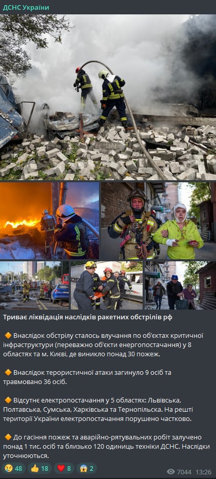 В результате обстрела произошли попадания по объектам критической инфраструктуры (преимущественно, по объектам энергоснабжения) в восьми областях и Киеве, возникло более 30 пожаров.