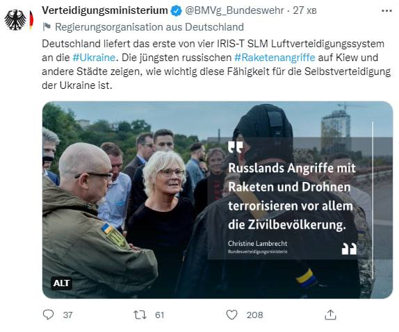 На фоне ракетных ударов по Украине Минобороны ФРГ заявило, что поставит Украине первую из четырех ранее уже обещанных систем ПВО IRIS-T.
