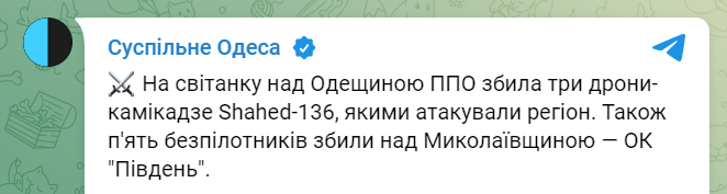 На рассвете во вторник, 11 октября, украинская ПВО сбила над Одесской области три дрона-камикадзе Shahed-136.