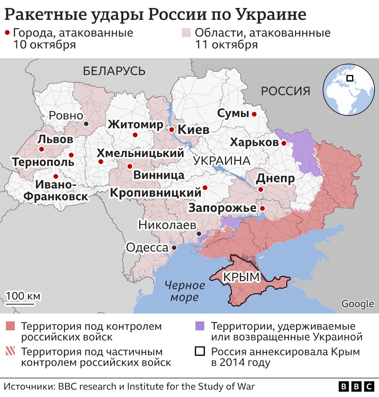 За минувшие сутки россияне нанесли 61 ракетный и 32 авиационных удара. Пострадала инфраструктура более 30 населенных пунктов. Это Киев, Львов, Ровно, Житомир, Тернополь, Хмельницкий, Ивано-Франковск, Винница, Прилуки, Нежин, Конотоп, Харьков, Кременчуг, Днепр, Кривой Рог, Запорожье, Николаев, Одесса.