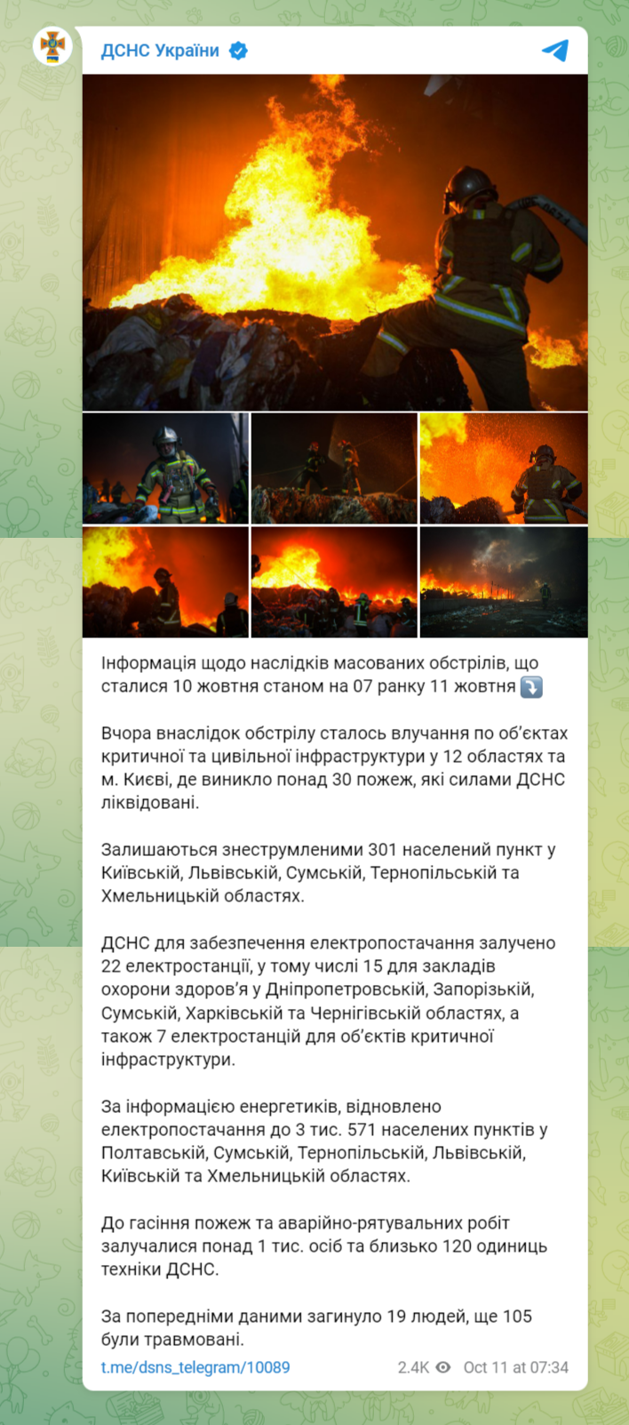 По предварительным данным, в результате вчерашнего обстрела произошло попадание по объектам критической и гражданской инфраструктуры в 12 областях и Киеве, где возникло более 30 пожаров. По предварительным данным, погибли 19 человек, еще 105 были травмированы.