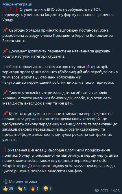 Студентов-переселенцев и тех, кто находятся на захваченных Россией украинских территориях, переведут на бюджетную форму обучения в вузах.