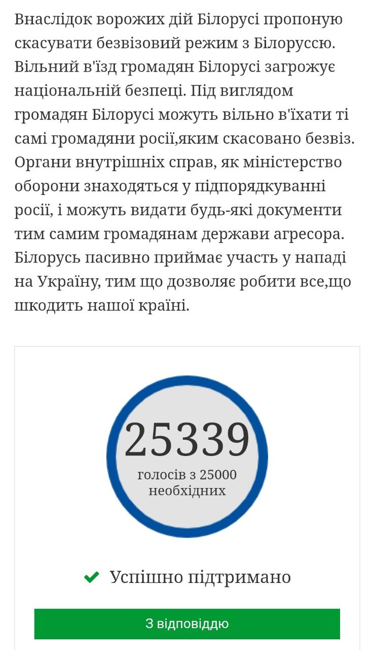 Петиция за установление визового режима с Беларусью набрала необходимые 25 тысяч голосов. На нее уже ответил президент Украины Владимир Зеленский.