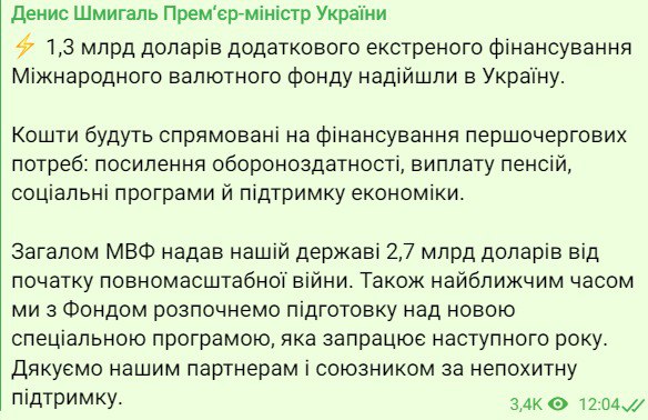 1,3 млрд долларов дополнительного экстренного финансирования МВФ поступили в Украину. Об этом сообщил премьер Денис Шмыгаль в своем телеграм-канале.