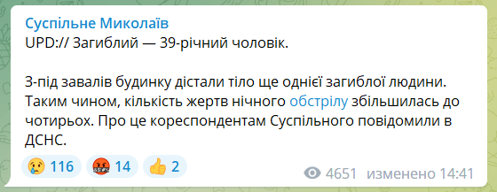Таким образом, количество погибших в результате ночных обстрелов увеличилось до четырех, сообщили "Суспильному" в ГСЧС.
