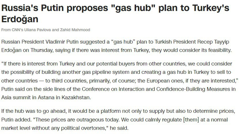"Если будет интерес со стороны Турции и наших потенциальных покупателей из других стран, мы могли бы рассмотреть возможность строительства еще одной газопроводной системы и создания газового хаба в Турции для продажи в другие страны — в первую очередь, в третьи страны, конечно; европейские, если они заинтересованы", — сказал Путин в кулуарах саммита Совещания по взаимодействию и мерам доверия в Азии в Астане в Казахстане.
