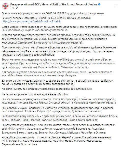 Война в Украине продолжается уже 233-й день. "Страна" следит за самыми важными новостями 14 октября в обновляемом онлайне.