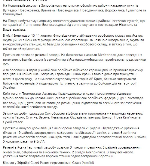 По данным Генштаба, россияне используют станцию, чтобы размещать там личный состав, в связи с тем, что объект не обстреливается.
