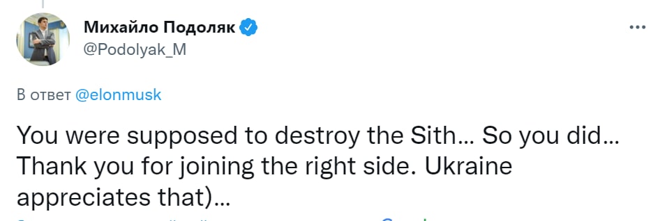 "Ты должен был уничтожить ситхов… Так ты и сделал… Спасибо, что присоединился к правильной стороне. Украина это ценит", - написал советник главы ОП Михаил Подоляк Маску в Твиттере.