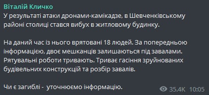 По данным мэра Киева Виталия Кличко, из-за атаки дронов-камикадзе пострадал жилой дом в Шевченковском районе. Эвакуированы 18 человек, предварительно, двое жителей остаются под завалами.