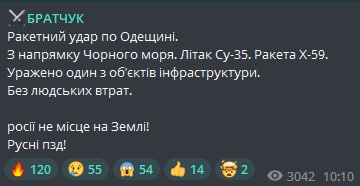 "Самолет Су-35. Ракета Х-59. Поврежден один из объектов инфраструктуры. Без человеческих потерь", - пишет Братчук.