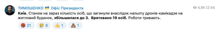 Замглавы Офиса президента Кирилл Тимошенко сообщил, что число погибших в результате утреннего обстрела Киева дронами-камикадзе увеличилось до трех человек.