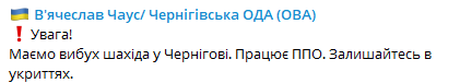 "Есть взрыв шахида в Чернигове. Работает ПВО. Оставайтесь в укрытиях", - написал он.