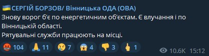 Напомним, 17 октября, во время очередного массированного обстрела Украины, в Винницкой области войска РФ нанесли ракетный удар по объекту критической инфраструктуры.