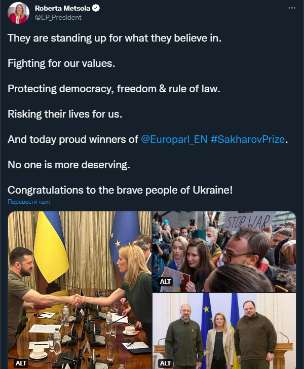 Об этом сообщила председатель Европарламента Роберта Метсола.