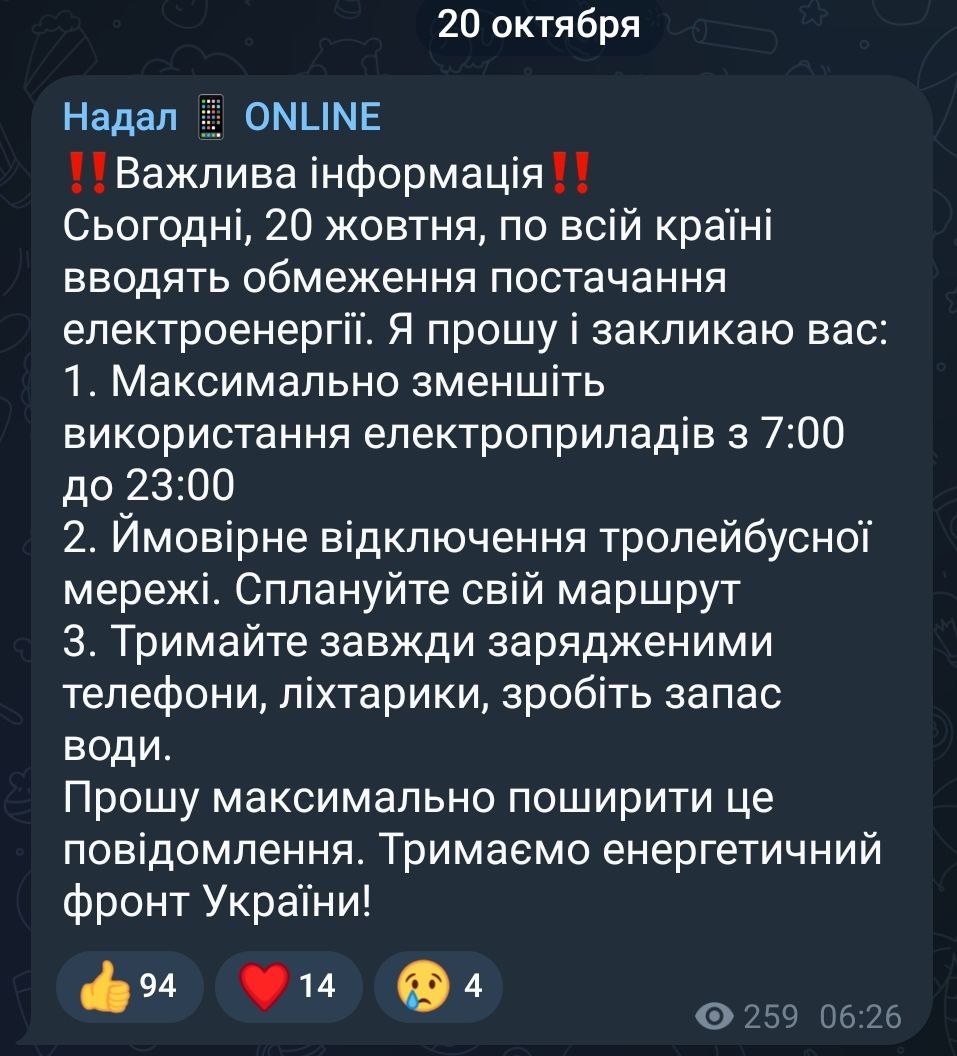 Он также напомнил, что необходимо с 07:00 до 23:00 минимизировать пользование электроэнергией и призвал зарядить телефоны, запастить фонариками и водой.