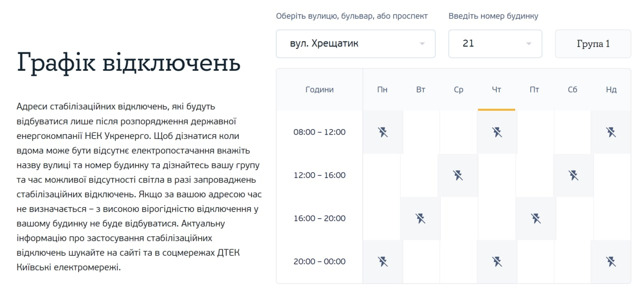 На сайте компании Yasno опубликовали график отключений света в Киеве по номерам домов.