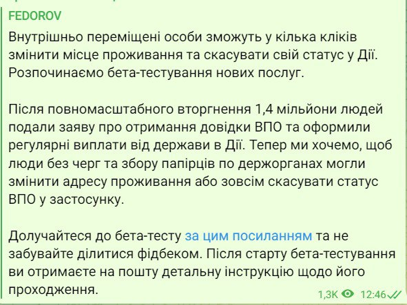 "После полномасштабного вторжения 1,4 миллиона человек подали заявление о получении справки ВПЛ и оформили регулярные выплаты от государства в "Дие". Теперь мы хотим, чтобы люди без очередей и сбора бумажек по госорганам могли изменить адрес проживания или отменить статус ВПЛ в приложении", – написал он.