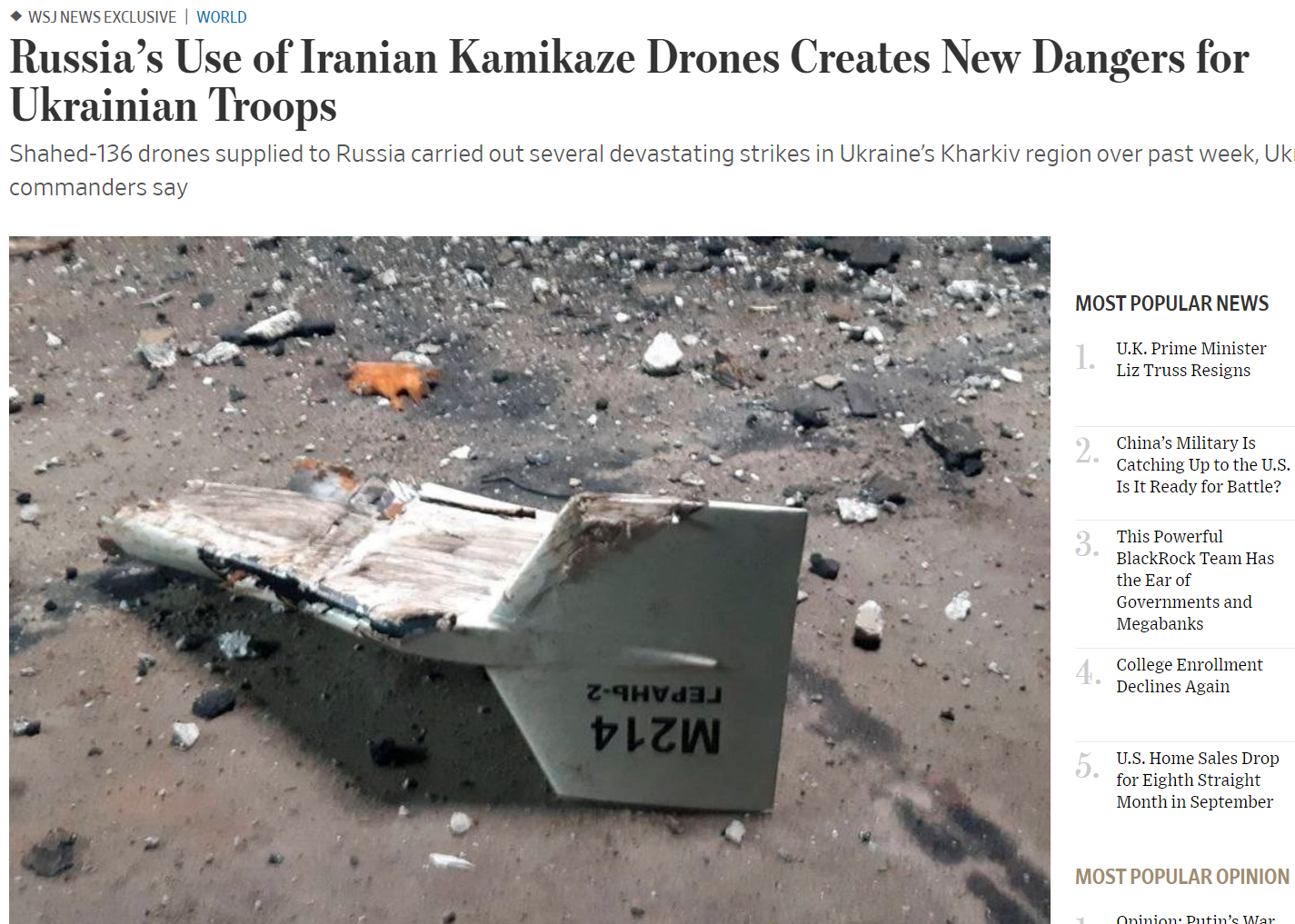 Еще месяц назад, 17 сентября, издание The Wall Street Journal анализировало данные о первом появлении иранских беспилотников в Украине. Как раз тогда в Харьковской области сбили первый из них.