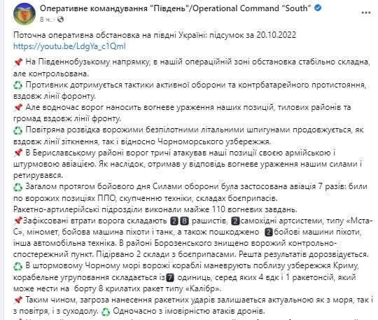 Об этом говорится в свежей сводке "Юг", обнародованной в Фейсбуке.